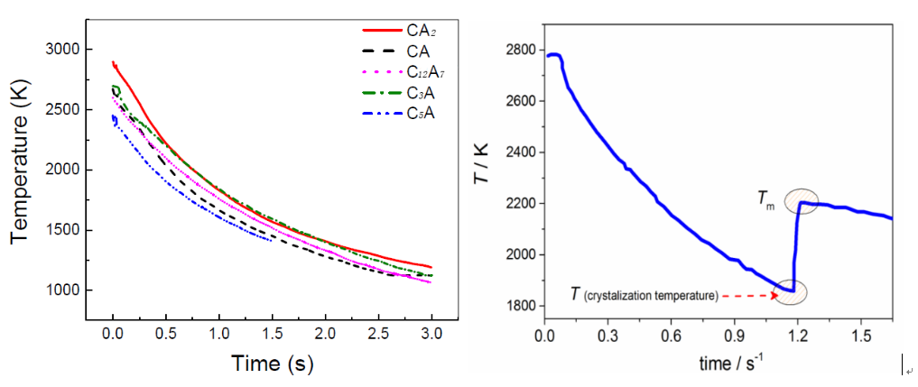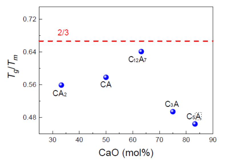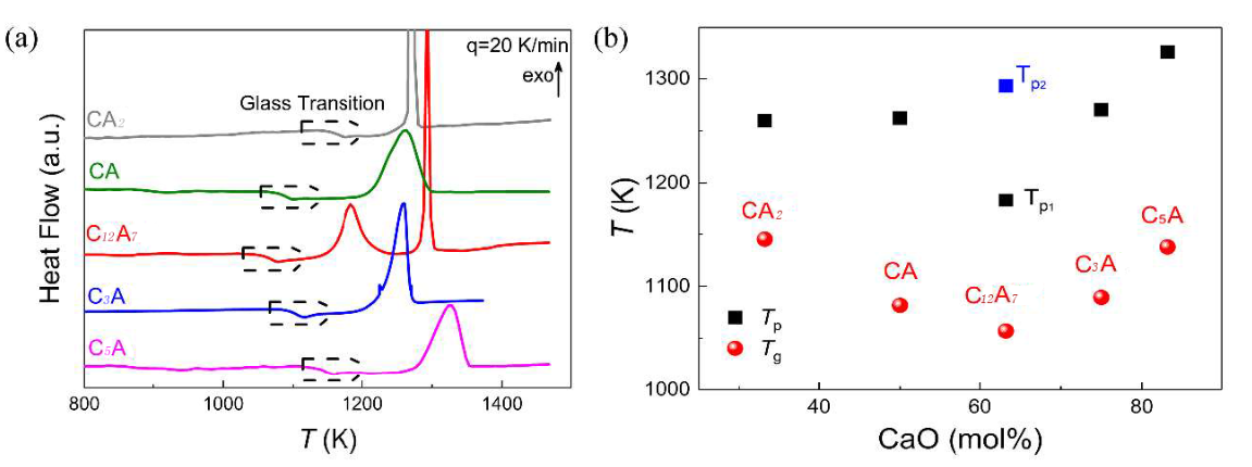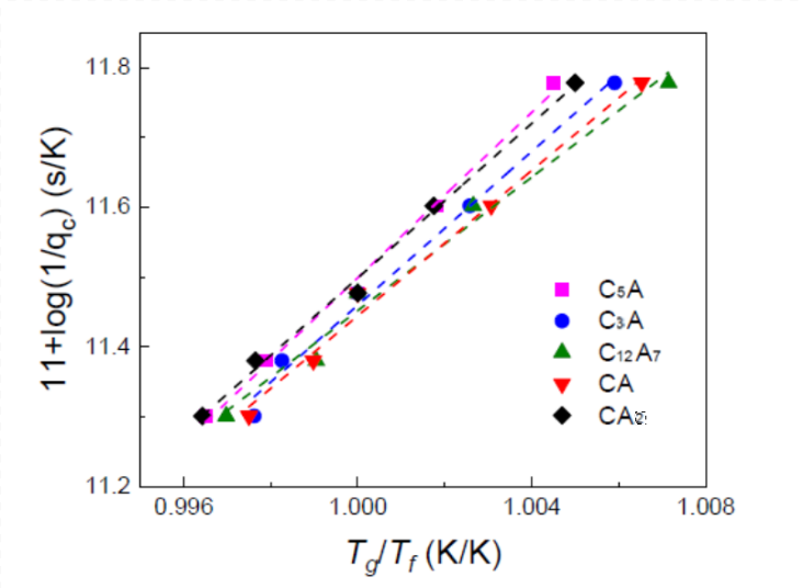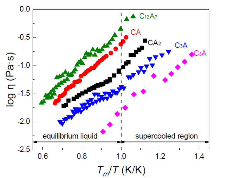 玻璃的形成能力与冷却速率密切相关,只要冷却速度足够快,任何物质都能形成玻璃,随着气动悬浮装置的应用,有效地避免了异相成核,增强xCaO-(1-x)Al2O3液体的玻璃形成能力,使得xCaO-(1-x)Al2O3二元系的成玻范围能够扩展到0.37 (CA2) lt;xlt; 0.83 mol%(C5A)的范围,获得了宽的组成范围的玻璃样品后,我们将可以通过气动悬浮装置测得高温(熔融温度以上)粘度、高温(熔融温度以上)密度相关数据,结合DSC测试拟合低温粘度来讨论玻璃转变过程,结合相关测试表征手段来探索钙铝酸盐玻璃强弱转变的微观机理。