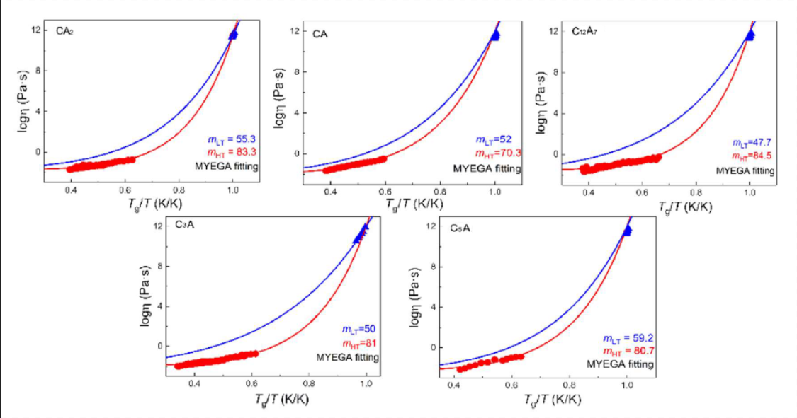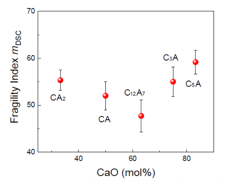 如前所述,玻璃的强弱性可以由脆性指数m值来表述,利用MYEGA方程,可以分别拟合玻璃熔点附近的高温粘度和玻璃转变点附近的低温粘度。有研究发现,对于水和某些金属玻璃在低温段(玻璃转变点附近)拟合得到的脆性指数更小,而平衡熔点附近的高温区域拟合出来的脆性指数更大。这种在不同温度区域的动力学脆性指数的差异表明,CaO-Al2O3体系的样品在从熔点到玻璃转变温度点的冷却过程中,经历了一个由脆性液体到强性液体的转变,称为强弱转变(Fragile-to-Strong Transition)[9][10]。这种在不同温度区域呈现不同的脆性指数的差异通过两者之间的比值来进行量化[11],即