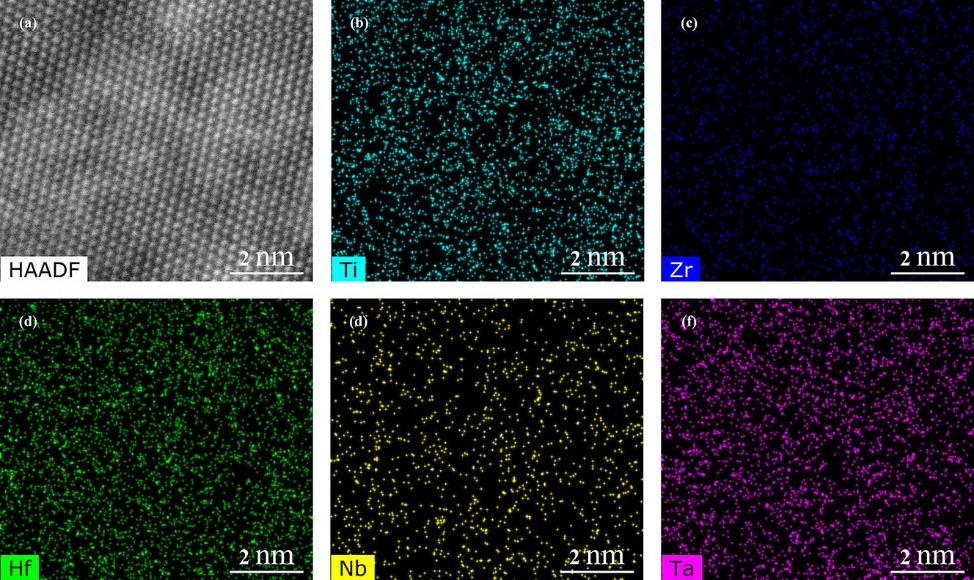研究表明,可在1950℃合成(Ti,Zr,Hf,Nb,Ta)C熵稳定碳化物,所得产物具有简单的面心立方结构,且无第二相存在。(Ti,Zr,Hf,Nb,Ta)C熵稳定碳化物内五种金属元素分布均匀,金属原子(Ti,Zr,Hf,Nb,Ta)和碳原子的排布整齐有序,且次晶格内五种金属原子随机排布。此外,(Ti,Zr,Hf,Nb,Ta)C熵稳定碳化物具有优良的热力学性能,且其烧结产物具有优良的力学性能。