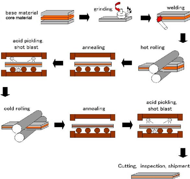 大马士革钢是一种复合钢材,由夹层材料和钢芯两部分组成。其生产过程是将夹层材料和钢芯材料进行磨削,使得表面平整,再通过点焊将两部分焊接在一起。之后通过热轧,让夹层材料和钢芯材料通过扩散融合成一个整体,再进行退火处理。再进行酸洗和喷丸处理后,进行冷轧、退火,之后酸洗和喷丸。其具体过程如下图所示: