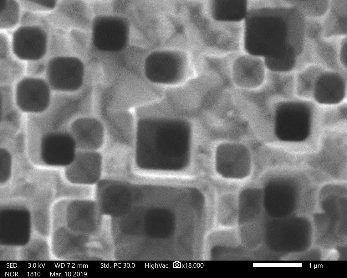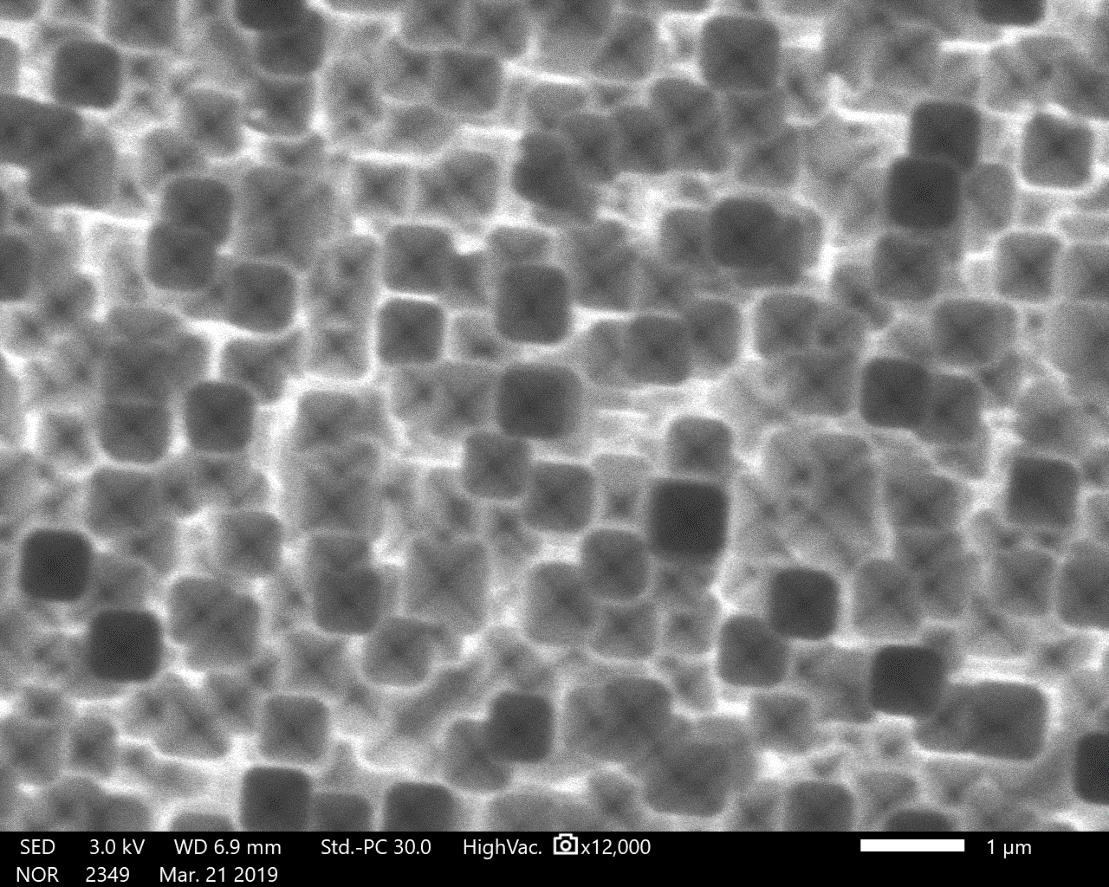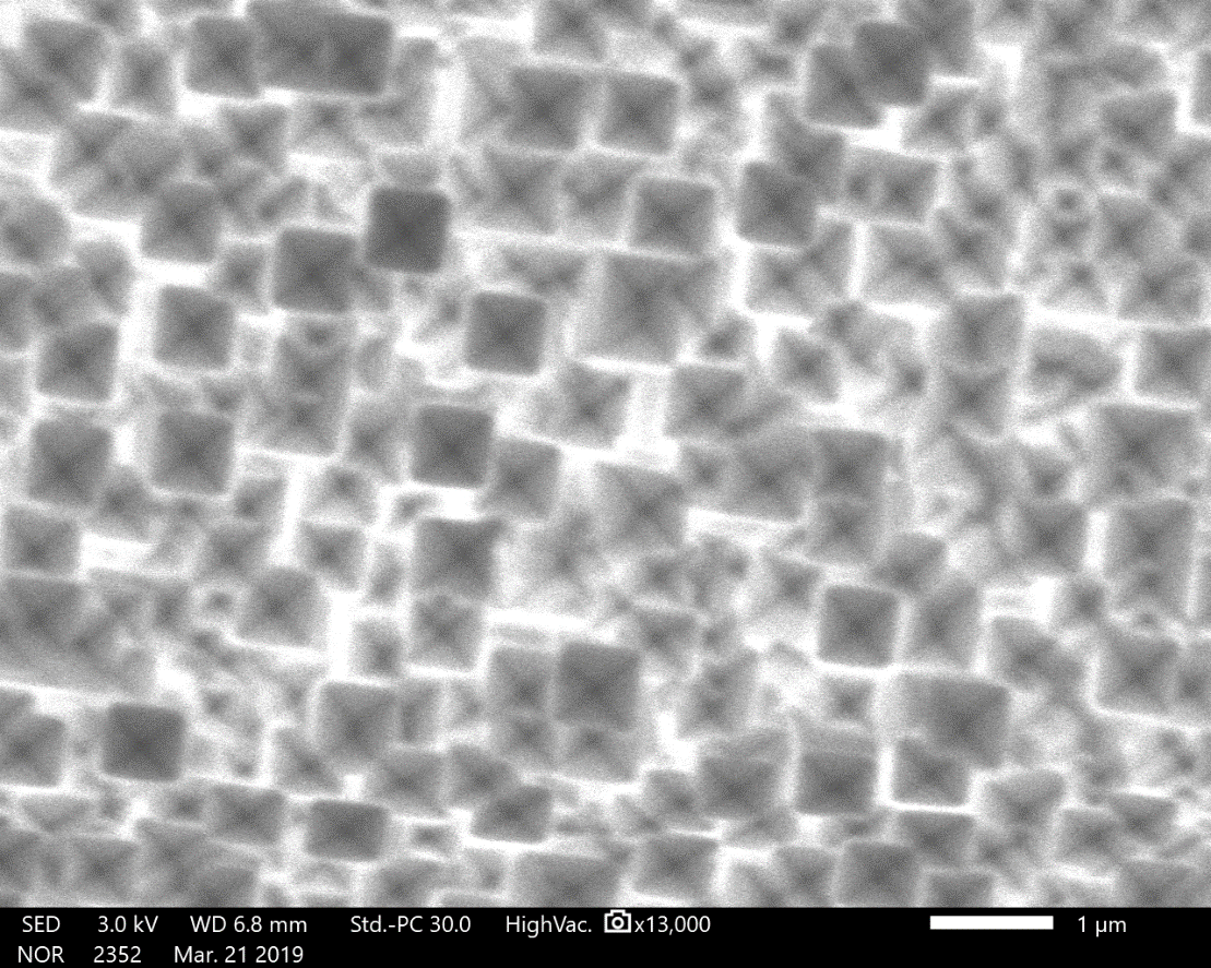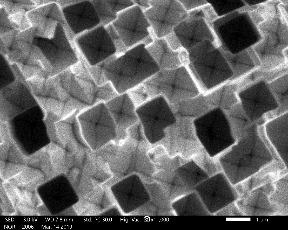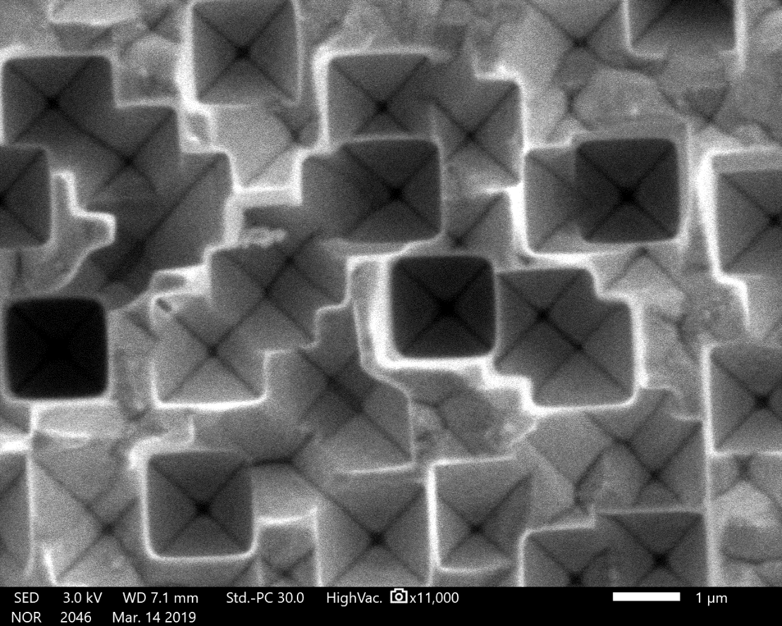 Keywords: single crystal silicon inverted pyramid reflectivity texturing metal ion assisted etching