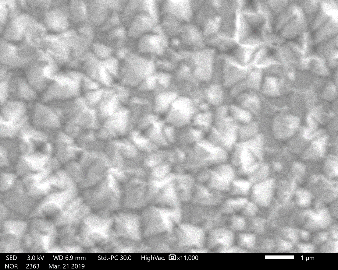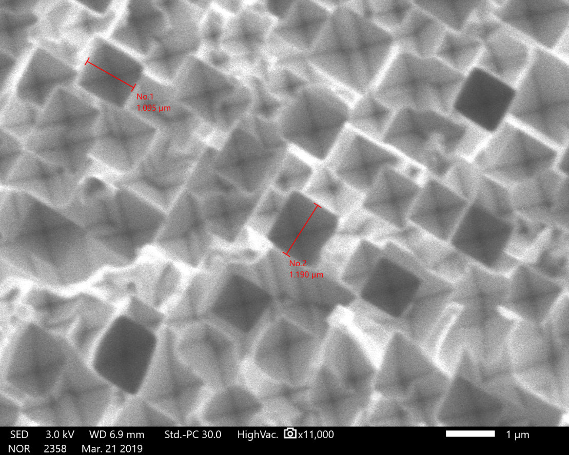 由于化石能源日益显出其弊端,人们展开了对清洁能源的研究,光伏电池是一种重要的生产清洁能源的方法。提升光伏电池的光电转换效率对光伏电池的应用有着重要的意义,而降低单晶硅片表面的反射率可以提升光电转换效率。在单晶硅片表面制备出倒金字塔结构可以显著降低单晶硅片表面的太阳光反射率。本课题通过设置在制备单晶硅片表面倒金字塔结构的几个重要过程中的时间为变量,找出了在预设溶液体系条件下合适的制备出单晶硅片表面倒金字塔结构的时间。在本实验预设的各处理体系溶液浓度下,当挖孔处理,扩孔处理和后处理均是在60℃时,采取挖孔处理时间为2分钟,扩孔处理时间为4分钟,后处理时间为9分钟可以在硅片表面得到最佳的测试平均反射率和硅片表面的倒金字塔结构微形貌。经反射率测试仪测试硅片表面平均反射率为9.78%。由扫描电镜图像得到倒金字塔孔径大小在1.7微米左右。