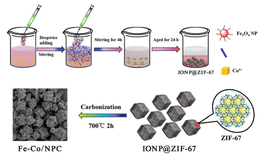 This design intends to exploit the advantages of the special structure and composite of MOFs to develop a lightweight and well performed material, and this material was characterized by XRD, SEM, TEM, etc. The graphitization degree, magnetic properties and specific surface area of the samples obtained by different calcination temperatures were analyzed by means of Raman, VSM, BET and network analyzer. This work paves the way for the synthesis of high performance lightweight microwave absorber.