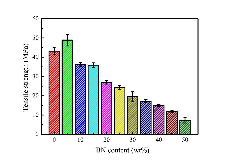 Boron nitride, as an inorganic non-metallic material with very high thermal conductivity, excellent insulation performance and stability, can effectively improve the thermal conductivity of polymer matrix, and with a small amount of addition, its unique microstructure can also strengthen the excellent mechanical properties of polyurethane matrix itself. With the addition of 5wt% boron nitride, the tensile strength of the composites reaches 48.9Mpa, which is 13.2% higher than that of pure TPU. The composite has a thermal conductivity of 3.057 W/m·K in the case of 50% boron nitride addition, which is equivalent to 1390% of the pure polymer matrix.