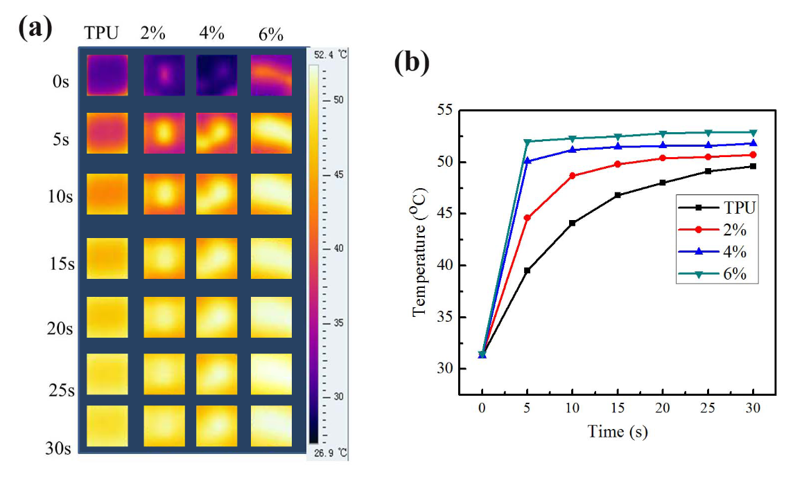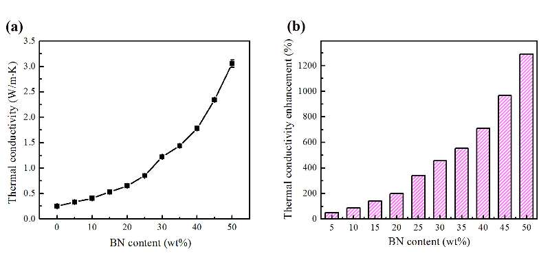 通过浇铸成型工艺制备的TPU/BNNS复合材料,在添加了6wt%纯氮化硼纳米薄片(BNNS)时,复合材料的热导率为0.34W/(m·K),相对于TPU提高了55%。