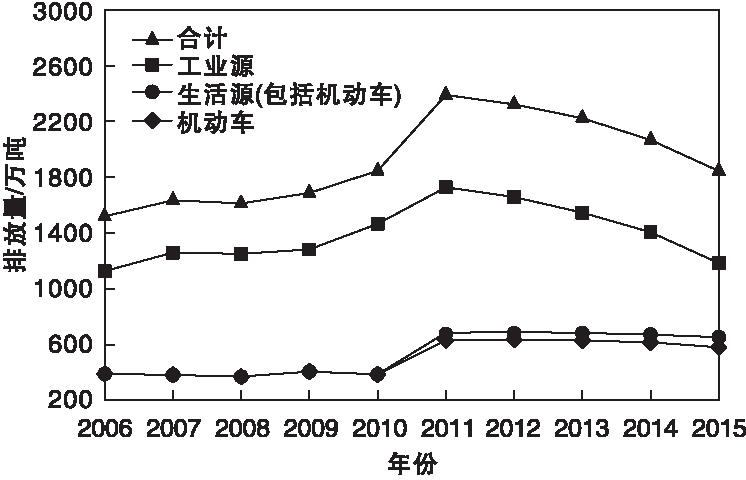 氮氧化物(NOx)不仅是大气主要污染物之一,而且是酸雨和光化学烟雾的前驱体,对于生态系统和人体健康造成严重威胁,NOx若进入人体中可与血红蛋白相结合,降低红细胞输送氧气的能力,引起组织缺氧[1]。船用柴油机尾气主要包括NOx(95%以上为NO)、一氧化碳(CO)、二氧化硫(SO2)等,其中NOx的处理是难点。根据《环境统计年报》近几年的数据统计表明(如图1-1所示),虽然2011-2015年全国NOx排放量总体呈下降趋势,但其总量依然很大[2]。在NOx的众多排放源中,由船舶柴油机排放的NOx占全世界排放总量的14-15%,在特定区域可能更高[3]。因此,船舶方向NOx的尾气处理成为大众关注的焦点问题,国际海事组织(IMO)及缔约国共同制定了船舶废弃排放标准的《73/78防污染公约》(MARPOL 公约)附则VI及修订部分,其中Tier III阶段对船用柴油机NOx的处理提出了更加严格的标准和要求。