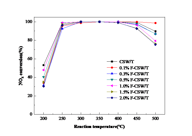 ② Fe-CeSnWOx/TiO2 system was examined for performance and the resistance to water and sulfur. When the Fe content was 0.1%, the catalytic activity of the catalyst increases by about 15% in the high temperature range (400-500 °C), about 98% which broadens the catalyst activity temperature window (300-500 °C); when the Fe content was more than 0.1%, the catalyst activity showed a downward trend. In addition, 0.1% Fe incorporation greatly improved the resistance to water and sulfur. After 300 °C, 200 ppm SO2, 5 vol.% H2O for 10 h, the catalytic performance dropped slightly from the initial 98.77% to 99.4%, after stopping adding water and sulfur, the activity can be completely recovered by proper heating and purging. In summary, tiny Fe incorporation can dramatically enhance the activity and the resistance to water and sulfur.
