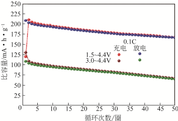 层状过渡金属氧化物的合成方法对其电化学性能也有一定的影响,因此可以调整合成方法来改善材料的性能。例如,Shaijumon 等人制备了P2结构材料Na0.5Ni0.25Mn0.75O2,从图1.6可以看出,该类材料具有比较高的比容量,在1.50-4.40V电压区间内在0.10C倍率条件下充放电循环时的可逆容量为210mAh/g,循环50圈后仍保持有大约80%的比容量[11]。