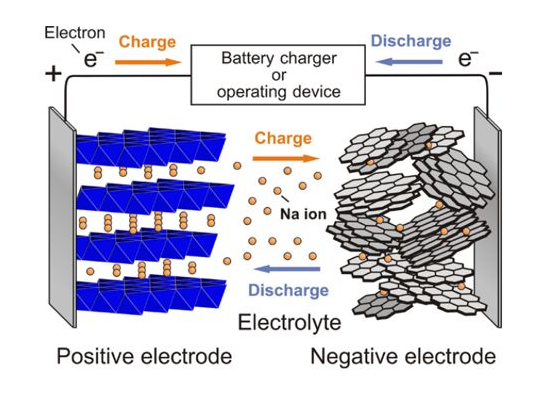钠离子电池通过钠离子在正负极之间反复的嵌入/脱出实现电荷转移和能量传输。充电时,正极发生氧化反应,钠离子从正极脱嵌经过电解液嵌入负极,负极进入富钠态,正极进入贫钠态,同时电子的补偿电荷通过外电路供给到负极,保证正负电极电荷平衡。放电时则相反,钠离子从负极脱嵌,经过电解质嵌入正极,正极处于富钠态,负极处于贫钠态。
