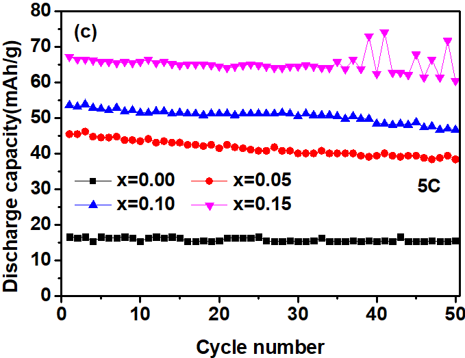 图1.5 缺钠型Na0.8Ni0.4-xCo2xTi0.6-xO2倍率循环曲线以及长循环曲线