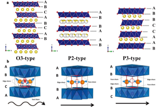 图1.2 (a)为三种晶体结构图 (b)为钠离子电池三种类型的钠离子迁移路径