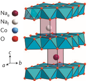 在钴酸钠正极材料中,钴离子占据了[CoO6]八面体中心位置,钠离子占据了三角形棱柱位点,由于P2相以ABBAAB…排列,钠离子在相邻两个层状结构中占据了不同的位置,如图1.3所示 [6]。