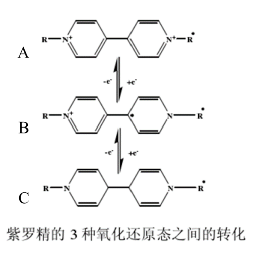 依据紫罗精中N原子价态不同可表现出三种氧化还原状态:最稳定无色的正二价阳离子,带有离域正电荷的正一价阳离子,本征态紫罗精分子。当R被芳香基团取代时该物质呈现绿色,而当R被烷基链取代时该物质呈现蓝紫色,因此紫罗精的颜色丰富。但由于有机小分子材料不能单独成膜,制备基于有机小分子的电致变色器件的工艺复杂且应用成本高,因而难以被广泛应用。