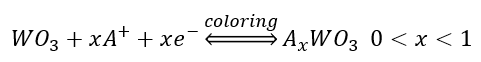 阴极电致变色材料是指处于负电位下被氧化而着色而处于正电位被还原而褪色的材料。主要是VIB和VB族如W、Mo、Nb、Ti等金属元素的氧化物。至今为止,在阴极电致变色材料里,WO3是被研究最多的,其电致变色原理如公式(1.1)所示:
