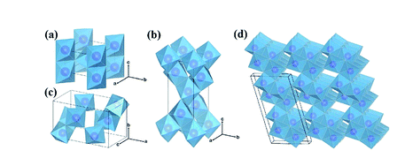 图1.1 二氧化钛晶体结构:(a)金红石,(b)锐钛矿,(c)板钛矿和(d)TiO2(B),紫色球形代表Ti原子,蓝色正八面体代表TiO6六面体