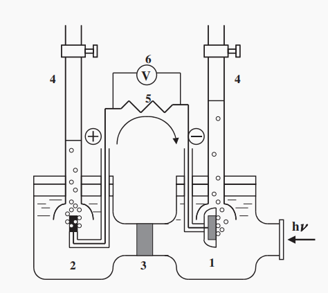 图1.2电化学光电池原理图:(1)n型TiO2电极;(2)铂黑电极;(3)离子导电分离器;(4)气笼;(5)负载电阻;(6)电压表[11]