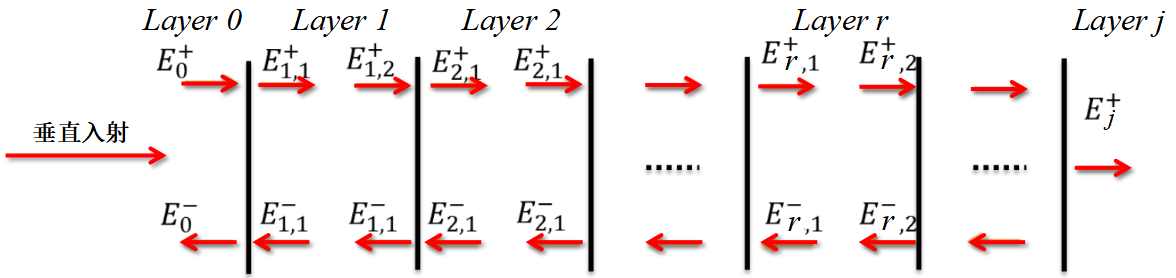 传输矩阵方法用于计算完美光滑的一堆均匀薄膜中的向前以及向后传播的电场。对于反射和透射,强度是所需的量,其可以从电场的平方获得[18]。对于椭圆偏光法,不同极化的反射光束的比率是重要因素。为了计算电场,我们从一个包含薄膜一侧向前和向后电场强度的矢量开始,