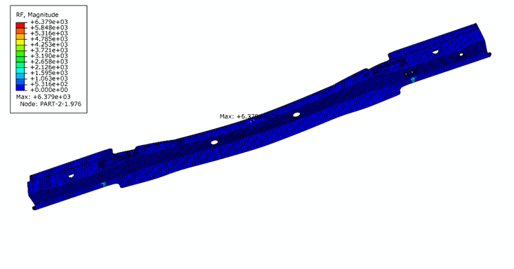 由于在汽车零部件仿真时,选取的网格大小一般为 5mm-10mm,因此本文选用边长大约为8mm 的四边形网格,单元类型为 S4R。[8]为了更加接近实际情况,此次模型并未在有限元分析前进行任何简化或修改,而实际汽车地板横梁由于拥有较多的精细曲面结构,因此一定程度上制约了划分网格的网格质量。本次划分网格采用的方法是以Sweep网格划分为主,剩余无法通过Sweep网格划分理论划分的精细结构采用自由网格划分,从而完成整个壳单元模型的网格划分。如图2.2所示黄色区域为基于Sweep网格划分理论进行的网格划分,粉色的区域是基于Free网格划分理论进行的网格划分。