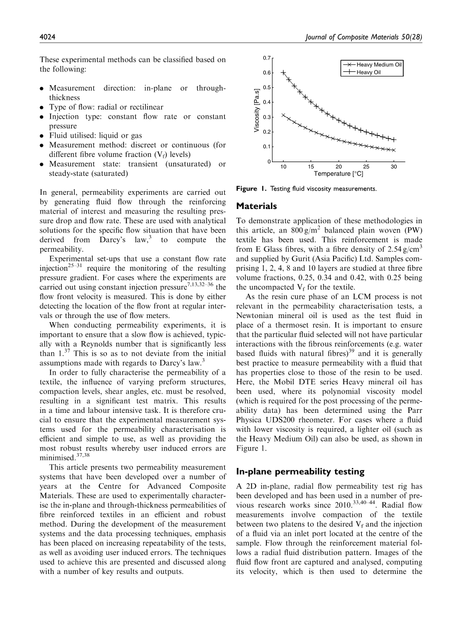 作为一个液体模塑成型工艺的树脂固化阶段与渗透特性测试是不相关的,牛顿流体的矿物油用作代替热固性树脂的流体。重要的是要确保所选择的特定流体与纤维增强材料(如水基于天然纤维的流体)不会有特殊的相互作用,39测量渗透率所使用的流体与使用的树脂的性质相近一般是最好的。在这里,美孚DTE系列重矿物油已经被使用,其多项式粘度模型(这是需要后处理的渗透性数据)是采用Parr物理uds200流变仪建立的。如果需要较低的粘度的流体,那么较轻的油(如重介质油)也可以使用,如图1所示。