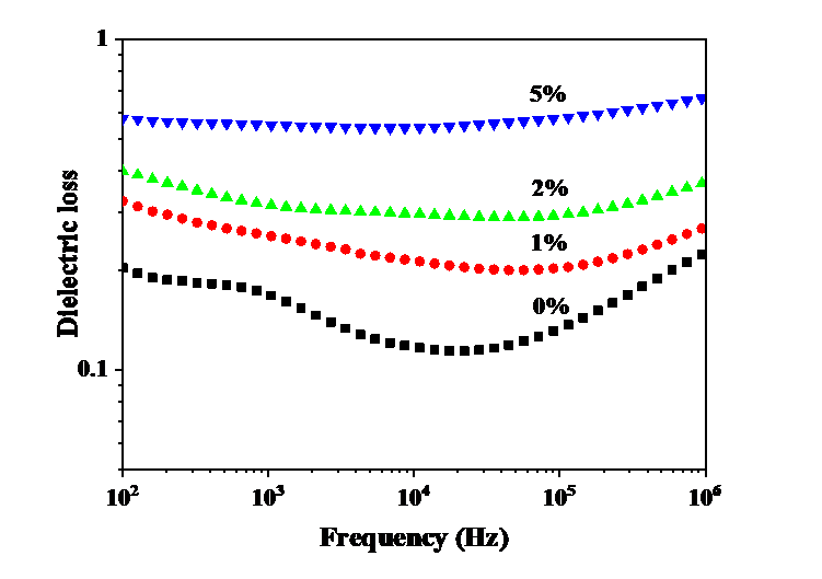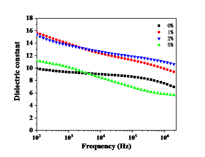 对聚合物而言,其内部原子主要是由共价键连接的,具有相对稳定的构象,但自由电子相对较少。在外电场作用下,容易产生的是离子极化和取向极化。但这两类产生的极化不足以提供足够高的介电常数,因此,本文采用共混的方法,增加复合物薄膜的缺陷,从而提高其介电常数。这些极化共同构成了电介质的储能部分。