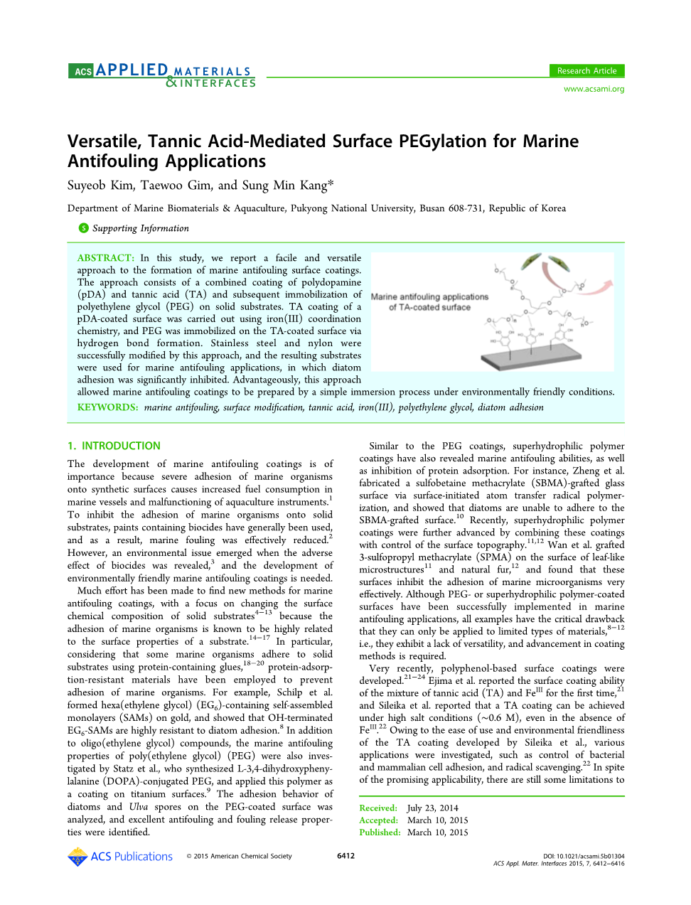 结合pDA / TA涂层与具有防污性能的PEG将产生通用的船用防污涂料。事实上,已知单宁酸在食品科学中是良好的PEG结合剂。在这里,我们主要报道的是pDA / TA涂层可以作为海洋防污表面涂层制备的有效平台。利用TA对于PEG的高结合能力(通过氢键结合),不含巯基和胺的PEG能够轻易地固定在pDA / TA涂覆的表面上。此外,涂层的多样性也使得船用防污涂料制备的多样化。