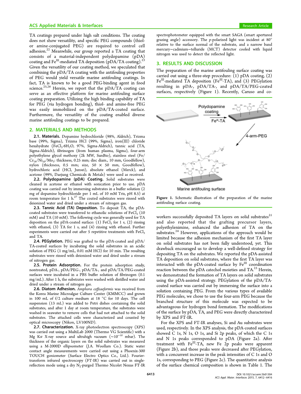 海洋防污表面涂层可使用如下三个步骤进行制备生产:(1)pDA涂层,(2)Fe III介导的TA沉积(Fe III -TA),和(3)pDA-,pDA / TA-和pDA / TA / PEG-包被的表面的PEG化(图1)。最近,Caruso和同事成功地在固体基材上沉积了TA层,并报道了接枝前体层和聚乙烯亚胺能够增强TA在固体基材上的粘附力。然而,该方法的应用却受到了一定限制,因为吸附在固体基材上的第一层TA层的粘附机制尚未被完全了解掌握。这个缺点迫使我们不得不制定一个更加明确的方案使得TA沉积在基材上。我们报告了pDA辅助TA沉积在固体基底上,其原理是利用Fe III在pDA儿茶酚部分和TA之间的配位反应使得第一TA层和被pDA涂覆的表面产生的相互作用。这里,我们证明了在固体基底上形成TA层使用的是pDA辅助策略。PEG化被pDA / TA涂覆的表面是通过将表面浸入到含聚乙二醇的溶液中。从各种类型的可用PEG分子中,我们选择使用四臂PEG,因为该分子的支链结构可预期,而且有利于氢键的形成。被pDA,TA和PEG改性过的表面可直接通过XPS和FT-IR来表征。