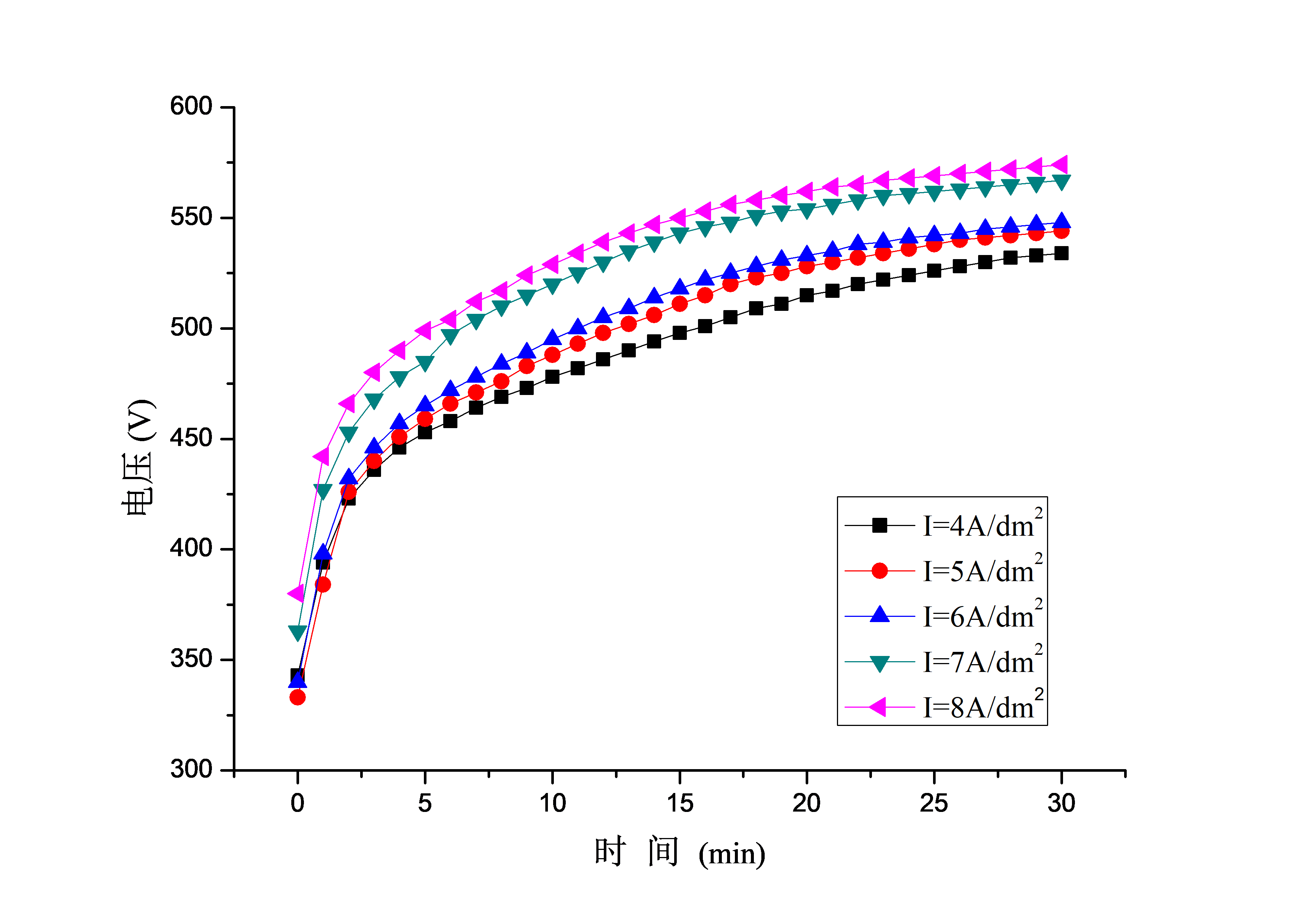 众所周知,铝合金具有密度小,易成形加工等优点,因而在众多领域应用广泛,但是铝合金的表面性能较差。针对铝合金表面的问题,当今市面上有不少表面处理工艺可以应用。但是通过综合对比,MAO的优势比较突出。微弧氧化产生的陶瓷层因具有良好的表面性能而恰好可以弥补铝合金的缺点[1]。此外,这种技术工艺简单生产效率高且处理过程环保,因而具有广阔的应用前景。值得探讨的是,MAO过程中有许多因素能够对陶瓷层产生影响。其中电流密度(Id)对膜层的影响甚大,因为Id直接决定了能量的大小,而能量越高则会使热电子发射数量增多,这会对膜层孔径和致密度造成不好的后果。