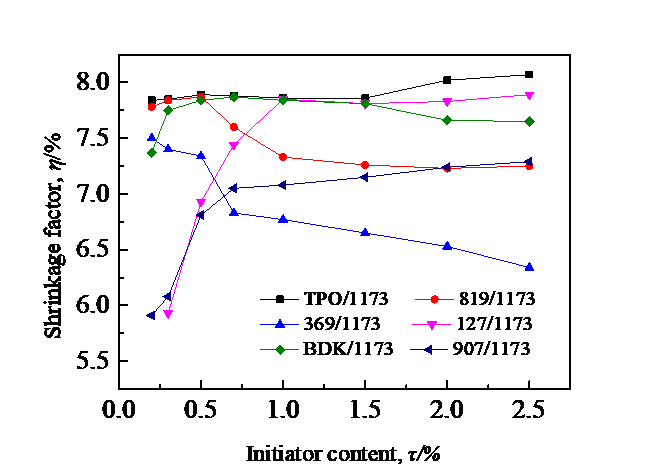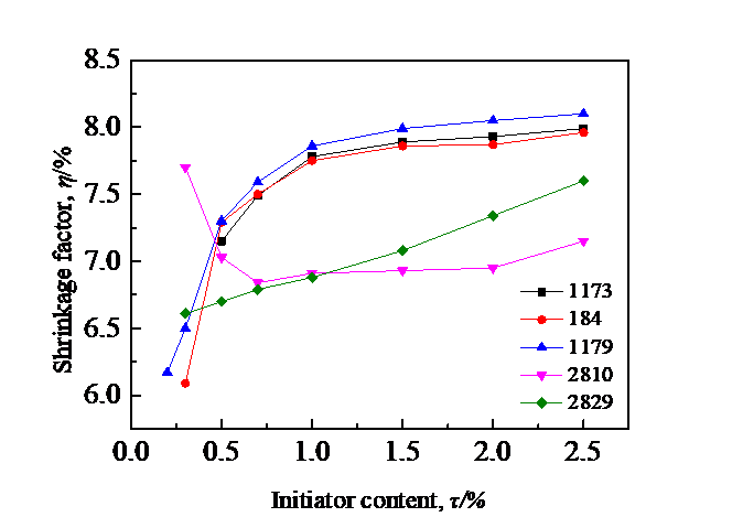 本文主要研究光引发剂对光敏材料收缩率的影响,通过一系列的数据对比,引发剂2810含量为4%,收缩率稳定在6.9%,拉伸强度为44.71Mpa,断裂伸长率为7.66%。所以认为引发剂2810为最优。