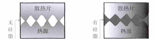 随着社会的进步,电子产品的发展越来越趋向于密集化和微型化;然而,电子产品的密集化和微型化对散热效率的要求也更高[1]。由于热聚焦现象,电子产品在工作时电能转化为热能会产生大量的热,如果其散热效率不好,很容易造成电子产品局部高温,从而直接影响到产品的使用寿命。导热硅脂是以硅油为基材,以大量的导热填充材料为辅材组成的导热介质材料。导热硅脂可以填充电子产品发热部位和散热部位之间的空隙,由于它具有很强的导热能力,可以及时将产生的热量释放出去,防止电子产品工作过程中发生局部高温,从而可以提高电子产品的工作效率及寿命。导热硅脂作为导热介质材料使用,能够满足电子产品的密集化和微型化要求,其性能会直接影响到电子产品的散热效果。图1-1导热硅脂的应用示意图[2]图 1-1导热硅脂的应用示意图