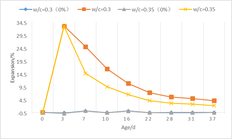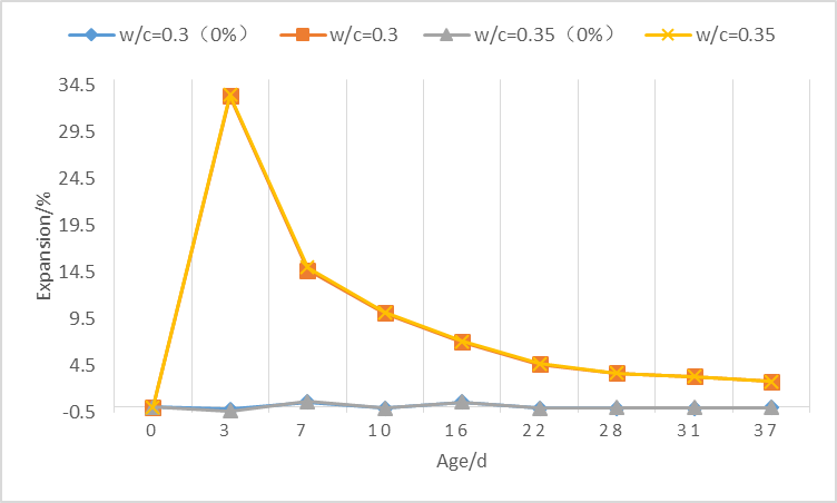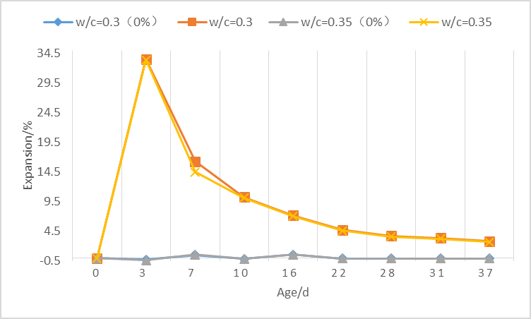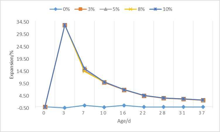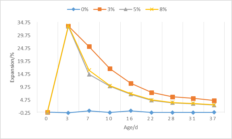 (1) For paste specimens, the higher the gypsum content, the greater the expansion rate of the specimens. In the early 3d and 7d gypsum test specimens, the expansion rate will increase rapidly, and the post-expansion rate will gradually decrease, but both are greater than No gypsum sample was added. At the same gypsum dosage, the w/c has little effect on the expansion performance of the test.