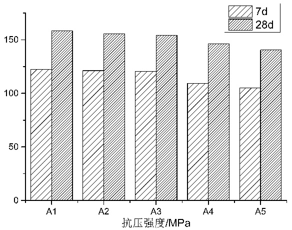 (2)通过对不同的参数进行对比实验,制备出具有较好工作性能和力学性能的C150高钛重矿渣砂超高性能混凝土,配合比参数为:水泥、粉煤灰微珠、硅灰分别占胶凝材料的68.2%、15.4%、16.4%,减水剂掺量2.5%,钢纤维体积掺量2.5%,胶砂比为0.96,水胶比为0.19,此时混凝土的塌落度和扩展度分别为270mm和675mm,其7d、28d抗压强度分别为120.3MPa和158.2MPa,28d抗弯拉强度为24.2MPa。