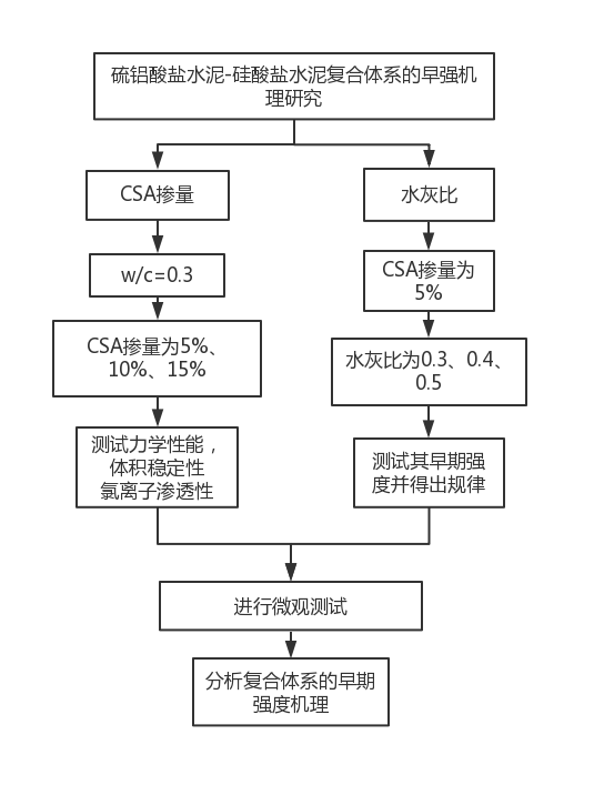 本课题主要是探究硫铝酸盐水泥掺量对硅酸盐水泥的性能的影响。改变硫铝酸钙水泥掺量制得样品,并测试其性能。研究水灰比对复合体系性能的影响。分析复合体系微观形貌,对复合体系早期强度机理进行研究。研究PC-CSA复合体系的抗压强度、干燥收缩性和抗氯离子渗透性。并通过水化热、XRD、TG、MIP、SEM等方法表征体系的水化过程、水化产物及微观结构演变。本课题可为无蒸汽养护预制混凝土的设计提供参考。