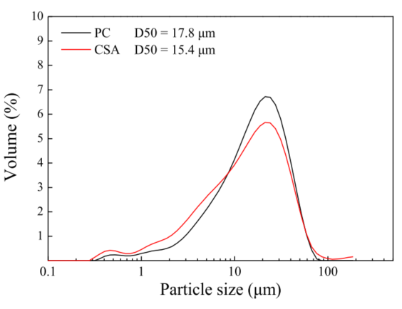 PC-CSA系统在复合混凝土中的应用研究还很少。在前人研究的基础上,应考虑PC中CSA的置换比和体系水灰比,因为合适的配比可导致早期强度较高,对后期强度的负面影响较小[15-17];低水灰比可以抑制钙矾石晶体的生长,改善孔隙结构,从而减轻其负面影响[18]。