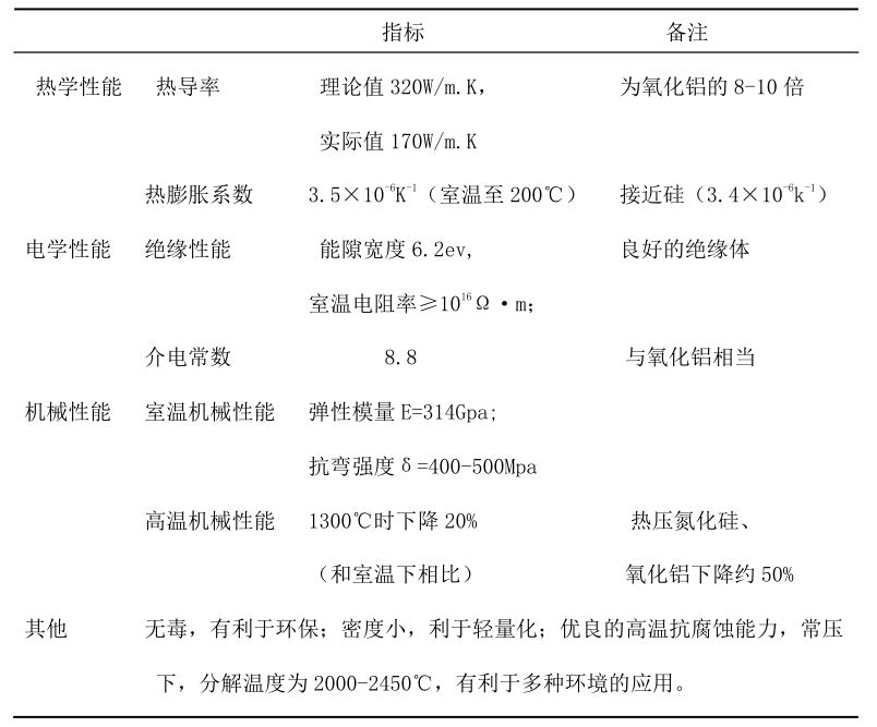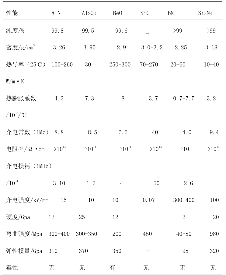 电子器件向微量、高集成度、高功率、高速、高效方向发展[1-2],单位体积内的发热量显著增大,这对电子基片材料及其封装材料提出了更高的性能要求。氮化铝(AlN)具有如表1-1所示的高导热率,低介电常数,优异的绝缘性能和适当的膨胀系数等显着性能,其在电子材料领域拥有非常广阔的前景。