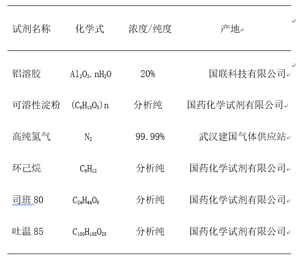 可溶性淀粉和铝溶胶作为碳源和铝源,环己烷作为油相,PVA作为交联剂,不同HLB值(司班80和吐温85)的复配作为乳化剂。采用微乳液法使溶胶在油项中分散成球。本次实验所用原料、仪器和设备如表2-1和表2-2所示: