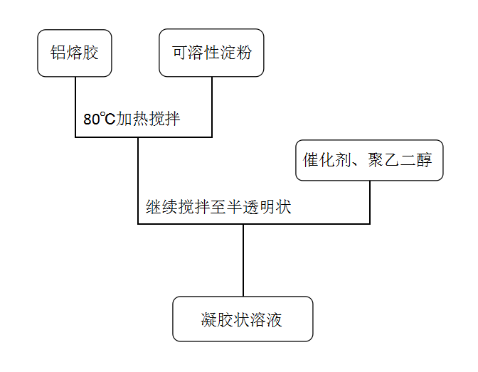 称取一定量的铝溶胶于玻璃烧杯中,水浴加热至80℃其目的主要是促进可溶性淀粉在铝溶胶中的溶解,在搅拌过程中,分批次逐渐将可溶性淀粉加入铝溶胶中,直至铝溶胶完全溶解淀粉,呈现澄清半透明的状态。可溶性淀粉的溶解需要充分的搅拌,不然易结块,并且要控制好温度防止淀粉的糊化。可溶性淀粉的水解过程是可溶性淀粉颗粒吸水膨胀,接着淀粉直链溶出、形成胶体,温度升高能提高淀粉的溶解度但是要防止淀粉的糊化,同时提高搅拌速度使淀粉更加分散,降低淀粉的溶解时间。最后,加入低体积乙醇、超声微波处理和碱的添加对淀粉的溶解度都有很大的作用,其工艺流程如图2-1所示。