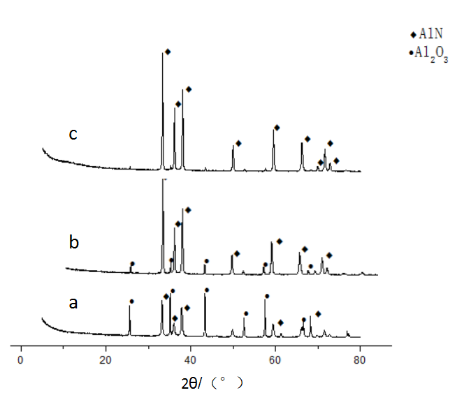 In the experiment, soluble starch and aluminum sol were selected as the carbon source and aluminum source, cyclohexane as the oil phase, PVA as the adhesive, and different HLB values (Span 80 and Tween 85) as emulsifiers. According to the theoretical carbon-aluminum ratio of 11:1 to 5:1, a sol-gel method was adopted to prepare a sol and disperse into spheres in cyclohexane, and the precursor was obtained by natural air drying and coke disposal at 600°C, and the part was at 700°C. Determine the actual carbon-to-aluminum ratio. The prepared precursor is nitrided in an atmosphere furnace, and the nitrided product is subjected to secondary carbon removal at 650° C., so that a relatively pure spherical aluminum nitride powder can be finally obtained.