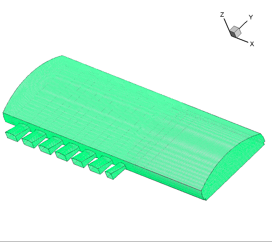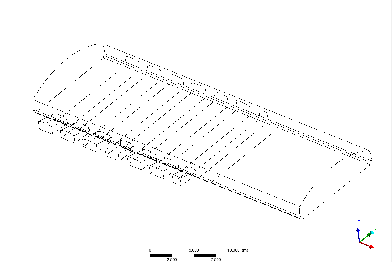 针对一产量为 600 t/d 的浮法玻璃熔窑,利用CFD软件Fluent建立模型进行数值模拟。图2.1是浮法玻璃熔窑的整体结构图,如图所示,浮法玻璃熔窑的火焰空间大体结构为长方体形,左侧为投料口;熔窑的长度为39.6m,宽度为12.6m,高度为3.668m;有7对小炉,燃料喷枪位于小炉口的下方,每个空气进口对应的窑墙上有一个烟气出口。图2.2是网格划分图,由图可知,网格划分的基本单元为六面体。