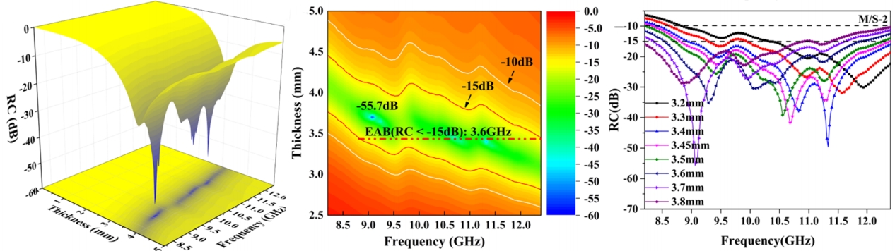 研究结果表明,以Ti3C2Tx/碳泡沫复合材料为吸波剂、石蜡为透波基体。与浓度为1mg/ml的Ti3C2Tx复合的柔性碳泡沫的吸波性能是最好的,其4.5mm的片层最大反射的损耗值为-46dB,吸波性能优良,但是与浓度为3mg/m和0.2mg/ml的Ti3C2Tx复合的柔性碳泡沫的最大反射损耗值为-23dB,由此可见在于1mg/ml的Ti3C2Tx复合得到的是吸波性能较好的材料。