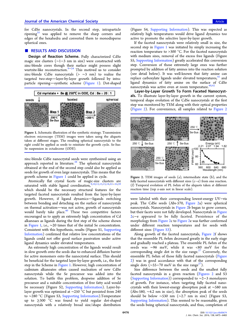 该报告描述了分两步合成几乎单分散的CdSe纳米晶体的策略,其集成PL fwhm与相应的单个点一样窄。第一步,优化生长条件,以区分完成与原子平面的起始。这样大约80年前,逐层生长的原因是三维逐层生长37,通过这项工作开发出的六面体具有六个固定面的单分散六面体持久地存在于较大的尺寸范围(gt; 3 nm)中用于CdSe纳米晶体。在第二步中,应用粒子内熟化35去除六面体的尖角和边缘,并将其转换为单分散球形。
