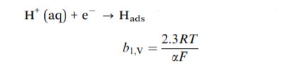 方程式中b是塔菲尔斜率,我们通常使用塔菲尔梯度来确定氢析出反应进行的路径,塔菲尔斜率表示当电流密度增加十倍时所需的电位差。通过将极化曲线(电流密度与电位)重新绘制为塔菲尔图,可以通过将塔菲尔图的线性区域拟合到塔菲尔方程来确定塔菲尔斜率,这是获得塔菲尔斜率值的最常用方法。 塔菲尔斜率的较小意味着增加相同的电流密度需要较小的过电位,这意味着更快的电荷转移动力学。alpha;是对称系数为0.5,T是绝对温度,F是法拉第常数,R是理想气体常数。