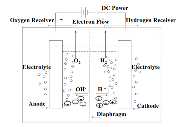 如图所示,水电解装置单元包括阳极,阴极,电源和电解质四部分组成[7]。对电极施加直流电(DC)以维持电荷存储并且电子流出负极。电子被氢离子(质子)吸收,仅形成氢。在保持电荷平衡的过程中,氢氧根离子(阴离子)通过电解质溶液移动到阳极,其中氢氧根离子发射电子并且这些电子返回到DC电源的正极。