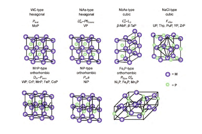 早期的研究表明,在室温下电沉积制备的无定形过渡金属 - 磷“合金”薄膜电极对析氢反应具有较高的活性[8]。当时人们推测这些电极的高催化活性源于在电化学制备过程中通过氢吸附调节的金属本身的电子结构,而不是催化剂本身[9-11],金属磷化物晶体结构如下图。