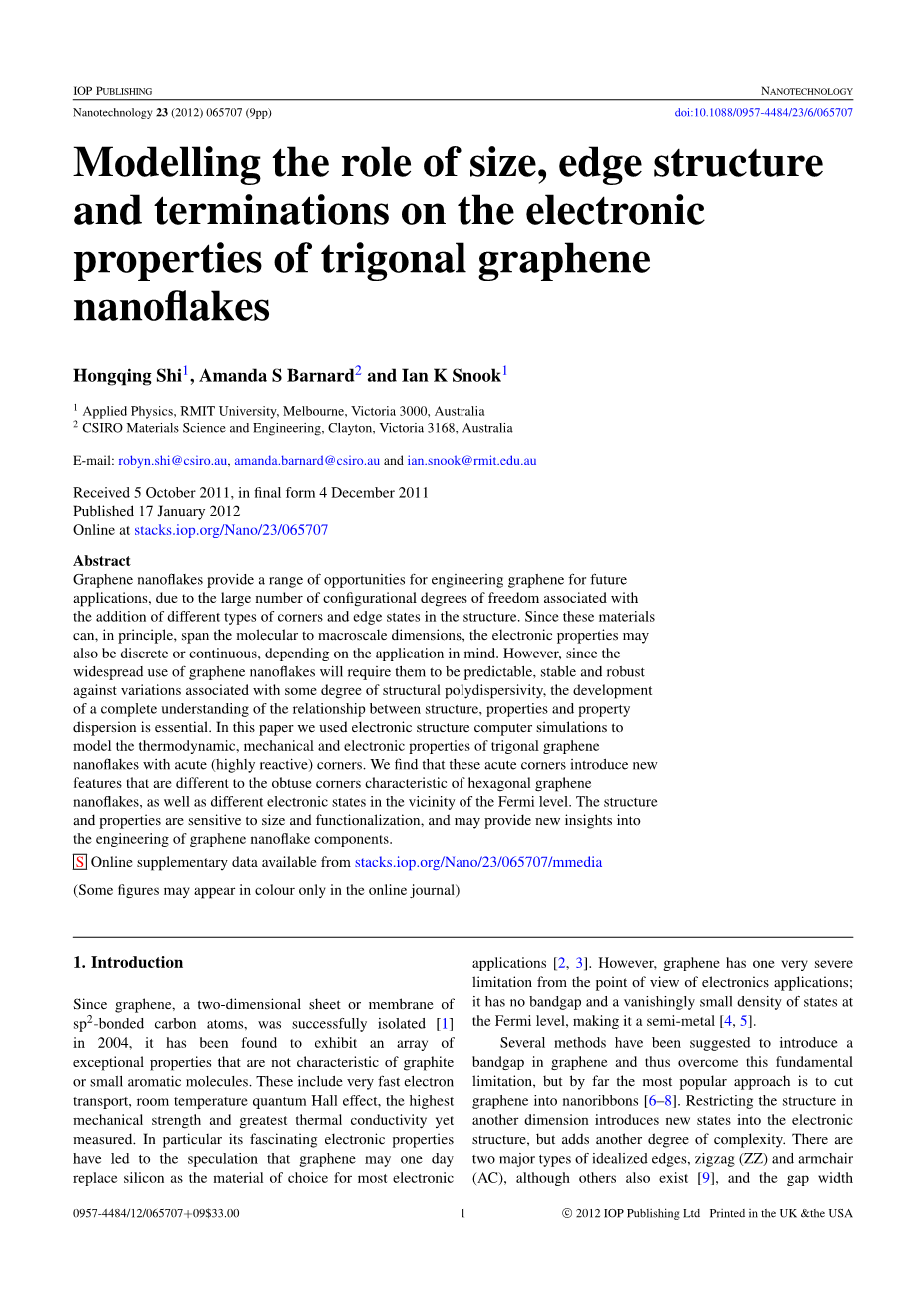 由于在结构中添加不同类型的角和边缘状态所伴随的大量配置自由度,石墨烯纳米薄片为工程石墨烯的未来应用提供了一系列机会。由于这些材料原则上可以跨越分子尺寸到宏观尺寸,因此根据应用的需要,电子特性也可以是离散的或连续的。然而,由于石墨烯纳米片的广泛使用将要求它们具有可预测性、稳定性和稳健性,以应对与某种程度的结构多分散性相关的变化,因此,全面了解结构、性能和性能分散之间的关系至关重要。本文采用电子结构计算机模拟的方法模拟具有锐角(高度反应性)的三元石墨烯纳米薄片的热力学、力学和电子性质。我们发现这些锐角引入了不同于六角石墨烯纳米片钝角特性的新特征,以及费米能级附近的不同电子态。结构和性能对石墨烯纳米薄片的尺寸和功能化十分敏感,为石墨烯纳米薄片的工程设计提供了新的视角。