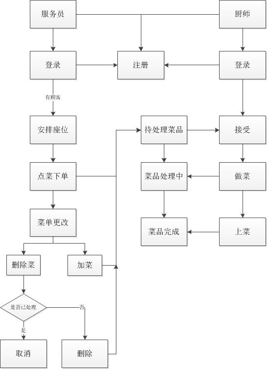 上图是整个软件的流程图,主要是对客户端的流程进行设计,客户端登录时对用户的身份进行核对,厨师进入厨师的页面,服务员进入服务员页面,当客人来时,服务员登录后安排座位,然后点菜下单,厨师接受订单后开始做菜。客人要改变订单时,若厨师已经处理则不能删除菜,若未处理,则可以删除,但无论何时都可以加菜[15]。