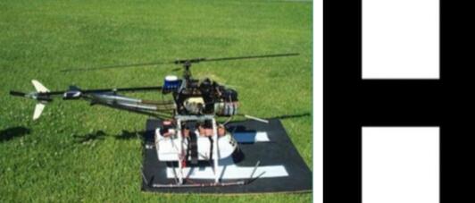 早在2003年,南加州大学(University of Southern California)就完成了利用视觉系统辅助的无人机自主着陆任务。Srikanth·S等人设计了“H”型陆标并利用卡尔曼滤波把惯性导航信息和视觉导航信息融合,来估计无人机的位姿[5]。南加州大学的机器人学与嵌入式系统实验室采用了无人直升机而非四轴飞行器来完成降落实验。他们实验使用的无人机及陆标如图1.1所示。