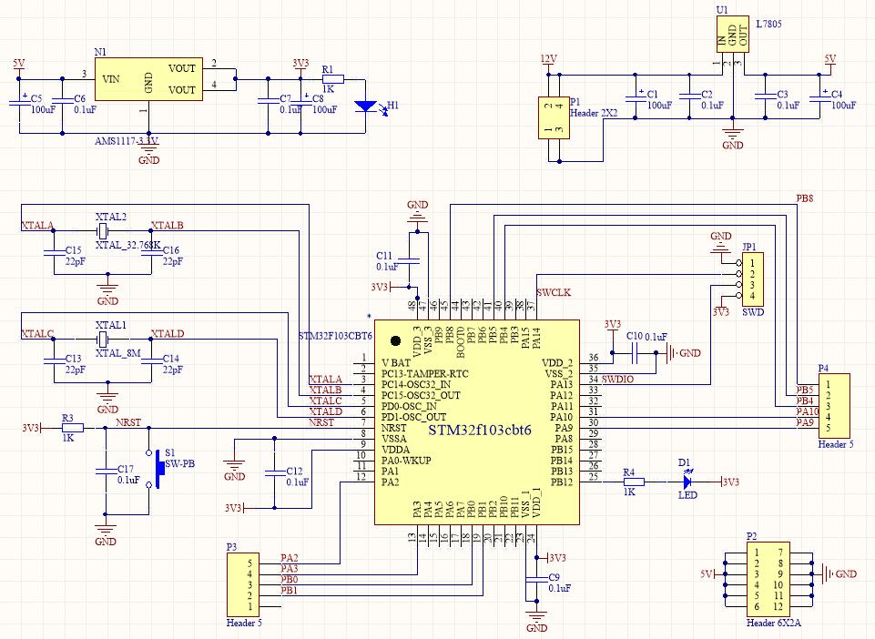得益于嵌入式技术的发展,使用微处理器及最小系统电路即可实现要求的绝大多数要求功能。STM32F103是意法半导体公司(STMicroelectronics)所设计的基于ARM Cortex-M3内核的增强型微处理器。芯片集成定时器、CAN、ADC、SPI、I2C、UART等多种功能,又因其具有体积小、功耗低、易于开发的优点,适合于无人机机载情景。