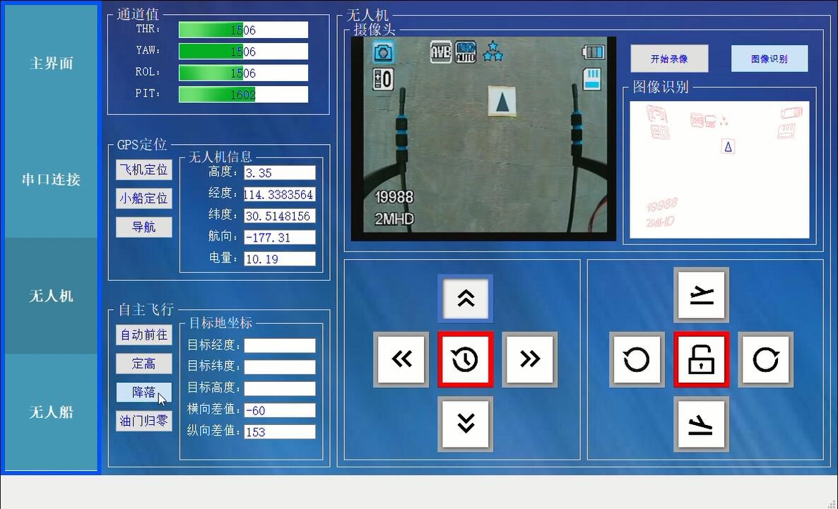 图像处理算法使用C 在Visual Studio 2017与OpenCV 3.4.3环境下进行编译与调试。调试通过后,算法会被移植到Qt环境下的上位机软件(已开源)中。上位机部分使用C 在Qt环境下进行开发,包含可视化用户界面(GUI),展示了包含电量、坐标、高度、摄像头画面等在内的无人机飞行状态相关信息;同时也提供了操作按钮,可以控制无人机进行解锁起飞、前进后退等动作。GUI上放置有一键降落按钮,用以实现无人机自动降落的任务。