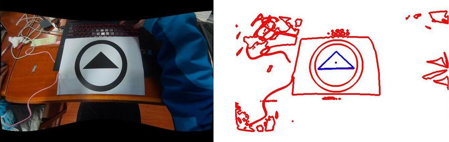 基于以上两条考虑,陆标在圆圈内部增加了一个黑色直角三角形。与圆相同,三角形也是基础图形,能够方便地进行检测。同时,三角形的直角朝向能够作为“方向零点”帮助无人机计算初机头朝向。使用圆和三角形的组合加强了图案判定与筛选条件,进一步降低了被干扰的可能性。