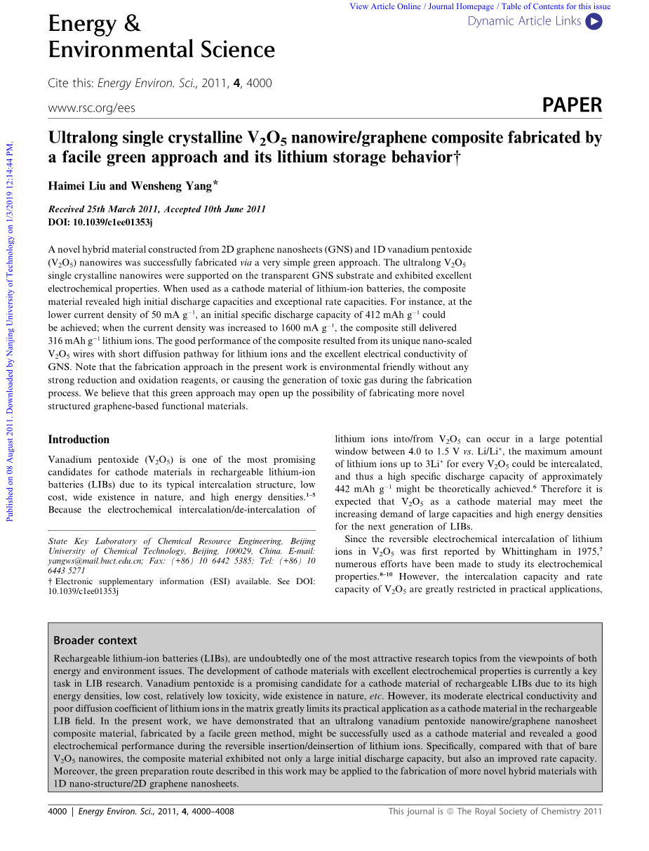 Because the electrochemical intercalation/de-intercalation of lithium ions into/from V2O5 can occur in a large potential window between 4.0 to 1.5 V vs. Li/Li , the maximum amount of lithium ions up to 3Li for every V2O5 could be intercalated, and thus a high specific discharge capacity of approximately 442 mAh g1 might be theoretically achieved.6 Therefore it is expected that V2O5 as a cathode material may meet the increasing demand of large capacities and high energy densities for the next generation of LIBs.